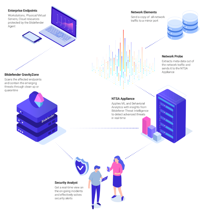 To successfully stop attacks and increase the cyber resilience of any organization, Bitdefender created GravityZone Ultra Plus. It combines the most advanced Prevention capabilities, low overhead EDR (Endpoint Detection and Response) and Network Traffic Analytics.